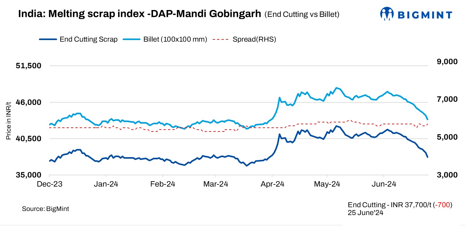 BigMint’s domestic end-cutting scrap index fell by INR 700/t to INR 37,700/t DAP in the Mandi Gobindgarh market on 25 June, 2024.