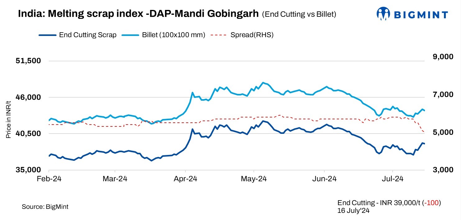 BigMint’s domestic end-cutting scrap index tracking the Mandi Gobindgarh market dropped by INR 100/tonne (t) to INR 39,000/t DAP on 16 July, 2024. Demand for semi-finished and finished steel was subdued in the region. Scrap shortage has enabled suppliers to capitalise on the situation, leading to significant disparities between scrap buyers and sellers. Steel mills are continuing to procure domestic scrap while remaining inactive in the imported scrap market.
