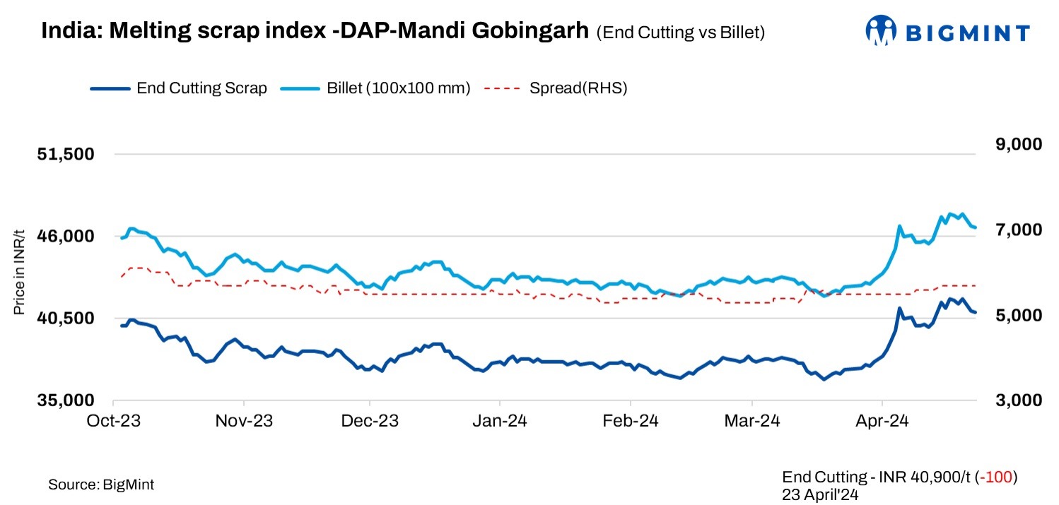BigMint’s domestic end-cutting scrap index in the Mandi Gobindgarh market declined by INR 100/tonne (t) to INR 40,900/t DAP on 23 April, 2024. Weak market sentiments and soft trade activity persisted in the major market. The most significant price decline was observed in Mandi’s light melting scrap grade, decreasing by INR 600/t w-o-w.