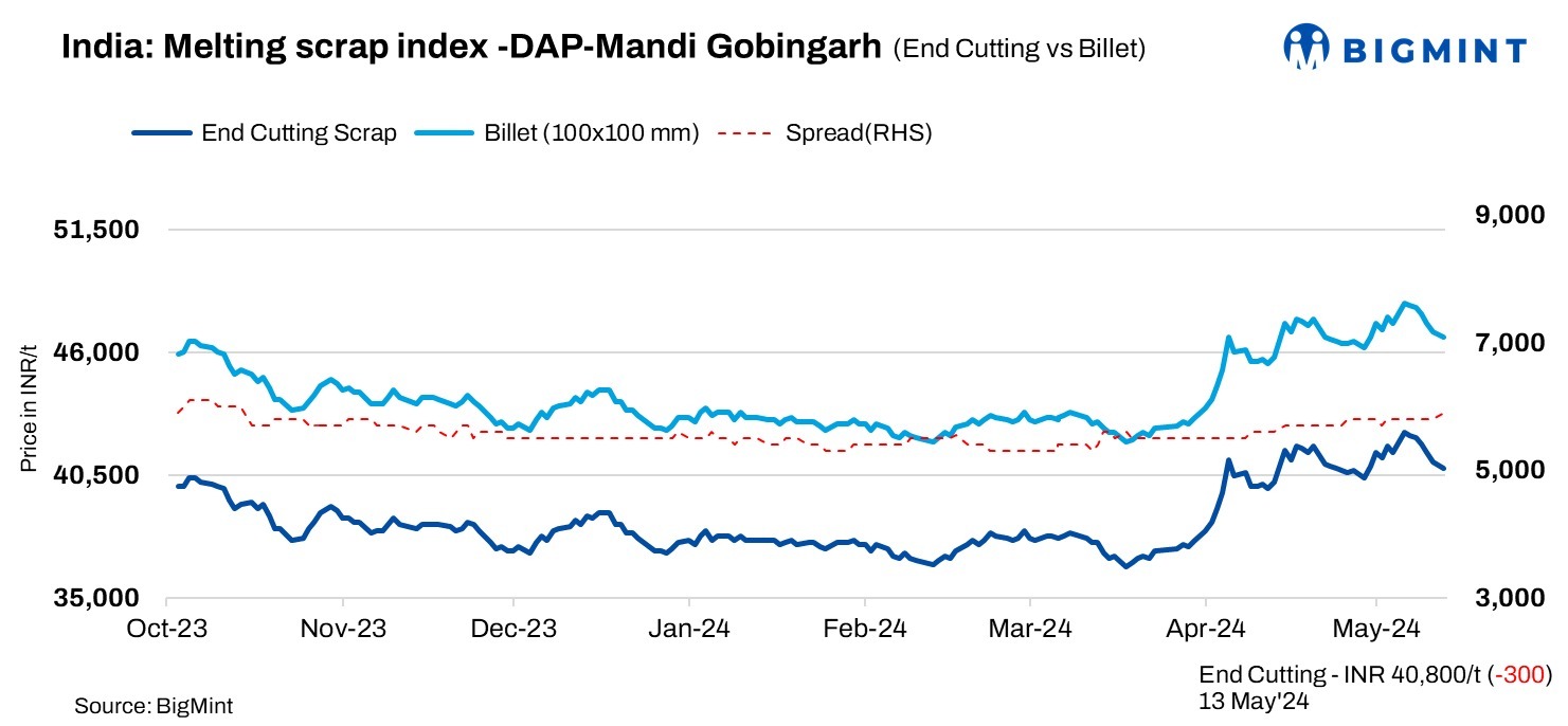 End-cutting, billets spread: In Mandi, the end-cutting scrap and billets spread was at INR 5,600-5,900/t.