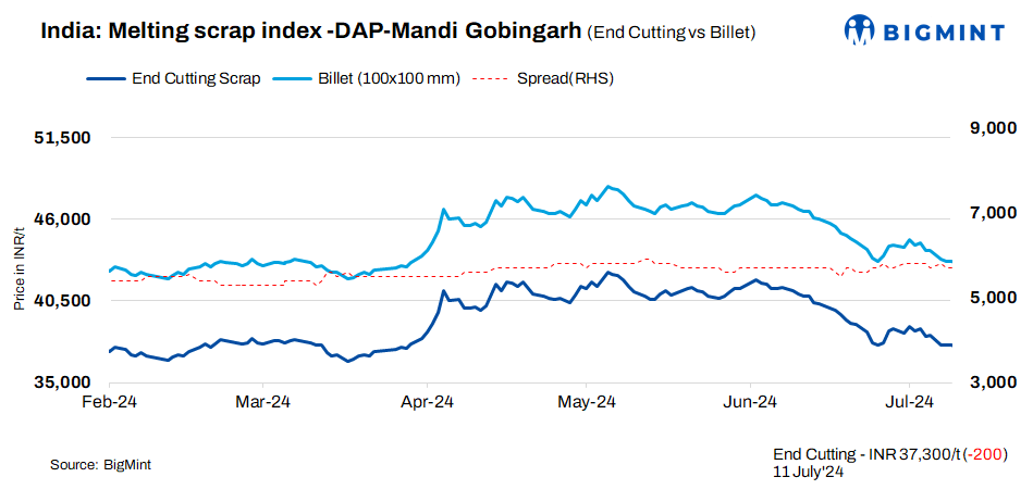 SteelMint’s domestic steel scrap (end-cutting) index fell by INR 200/tonne (t) d-o-d to INR 37,300/t ($446/t) DAP Mandi Gobindgarh on 11 July, 2024. The Mandi steel market experienced scrap shortage as mills maintained a moderate level of purchases. While the arrival of domestic scrap was average, weak sentiments and soft trade activities were seen in this key north Indian market.
