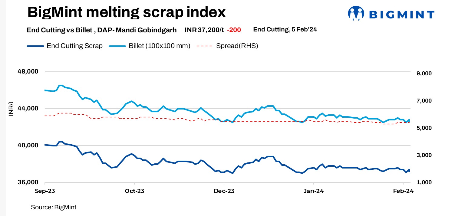 BigMint’s index for domestic steel scrap (end-cutting) in Mandi Gobindgarh recorded a drop of INR 200/t on 5 February, 2024, reaching INR 37,200/t on a delivered-at-plant (DAP) basis. The mills in Mandi are acquiring domestic scrap at a subdued level today, aligning with the sluggish activity observed in the finished steel market.