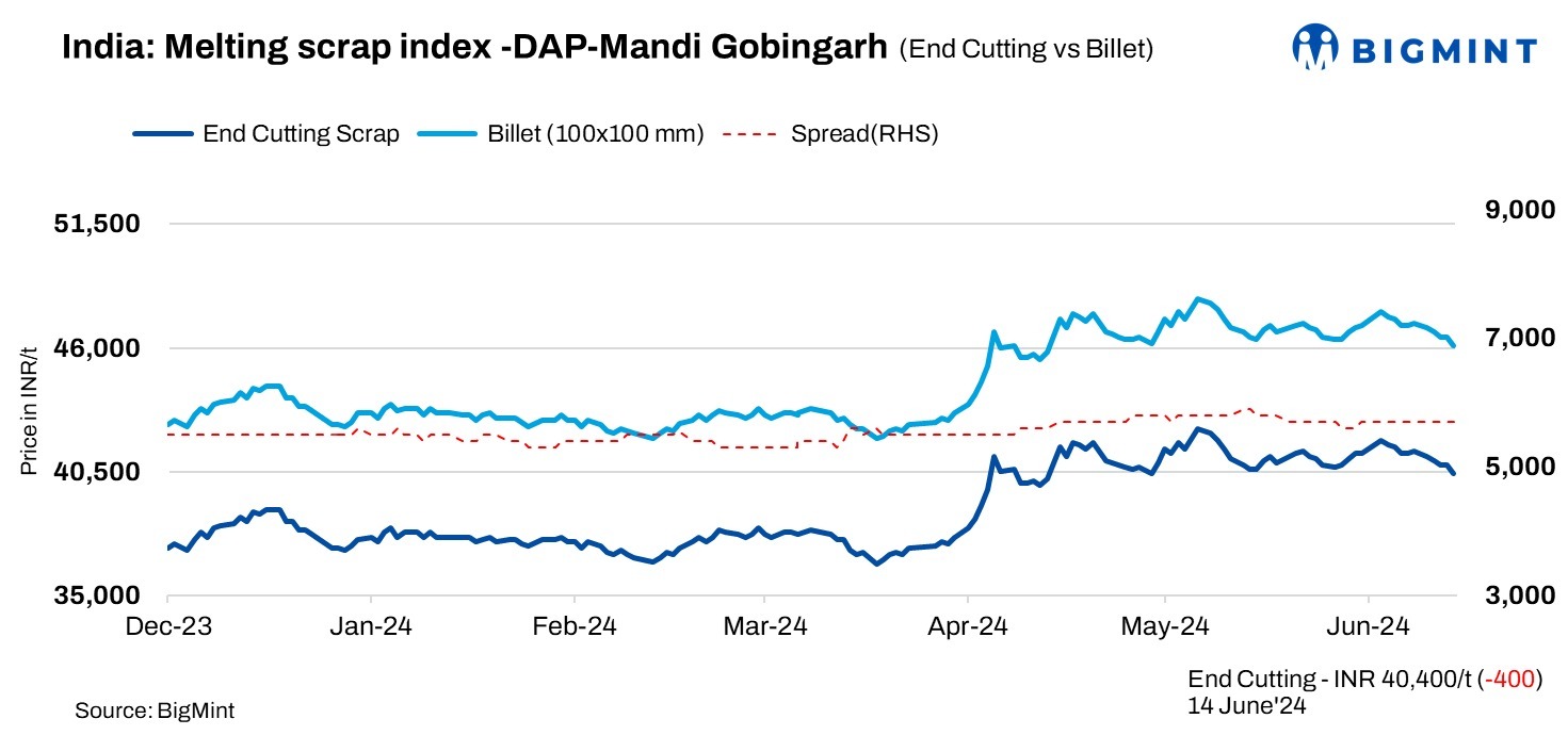BigMint’s domestic end-cutting scrap index in the Mandi Gobindgarh market dropped by INR 400/tonne (t) to INR 40,400/t DAP on 14 June, 2024. With mills facing the pressure of subdued demand in the semi-finished and finished steel markets, scrap procurement has slowed down considerably. So, mills have adjusted their offers downward and are taking control of negotiations. Scrap suppliers are grappling with the dual challenge of dwindling prices and mills’ discounted offers, driven by the influx of imported scrap into the market.