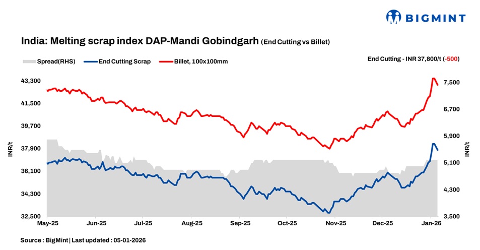 BigMint’s domestic end-cutting scrap index, tracking the Mandi Gobindgarh market, decreased by INR 500/tonne (t) d-o-d to INR 37,800/t DAP on 3 Jan 2026.