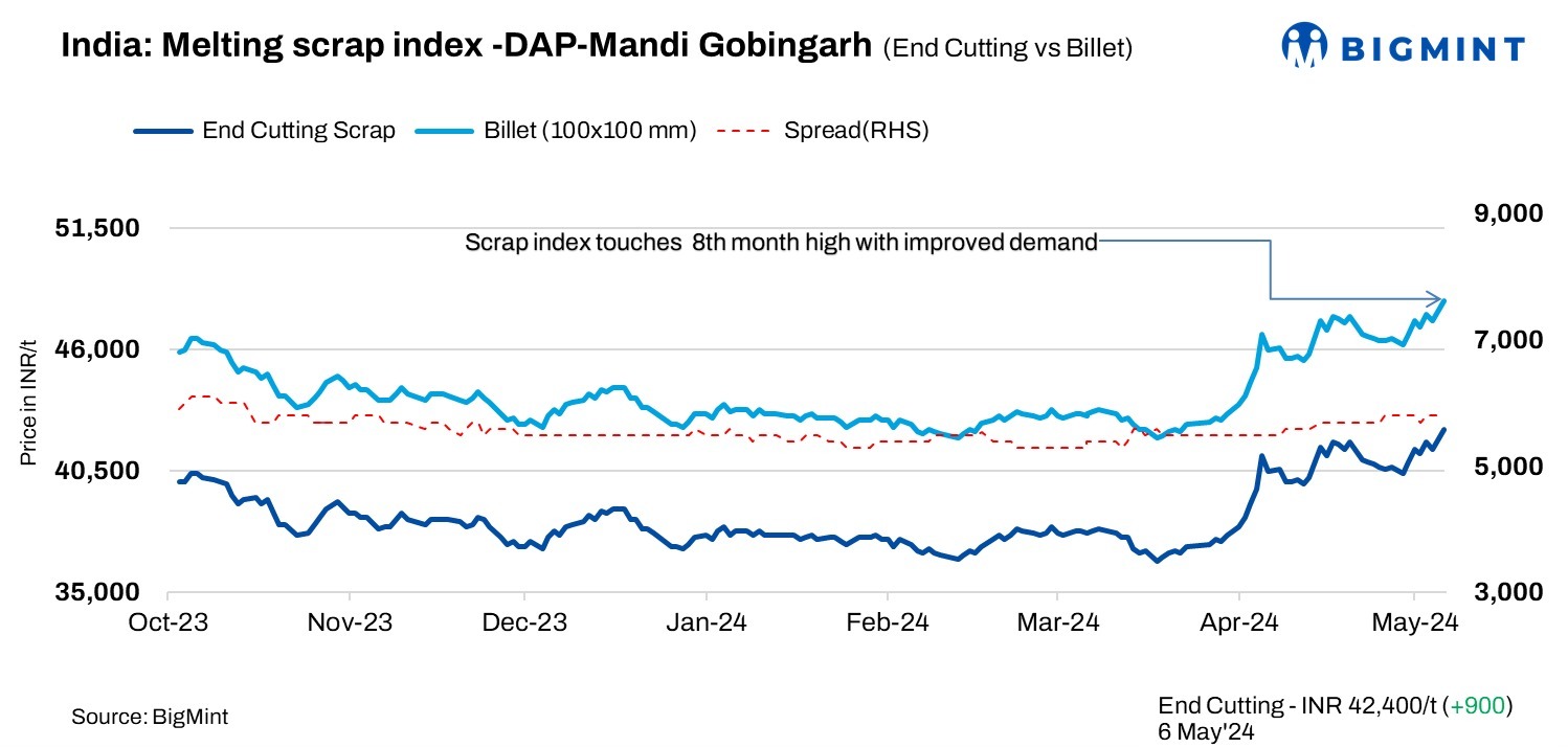 BigMint’s domestic end-cutting scrap index in the Mandi Gobindgarh market rose by INR 900/tonne (t) to INR 42,400/t DAP on 6 May, 2024. A substantial improvement has been observed in scrap prices, with a d-o-d surge of INR 800-1,000/t in the region, reaching its highest point in eight months, touching the levels observed on 5 September, 2023. Prices increased by INR 2,000-2,200/t w-o-w in the scrap market.
