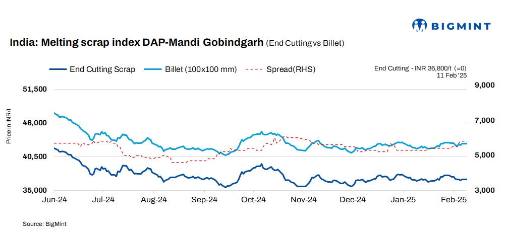 BigMint’s domestic end-cutting scrap index, tracking the Mandi Gobindgarh market, held steady d-o-d at INR 36,800/tonne (t) DAP on 11 February 2025 for the second consecutive day.