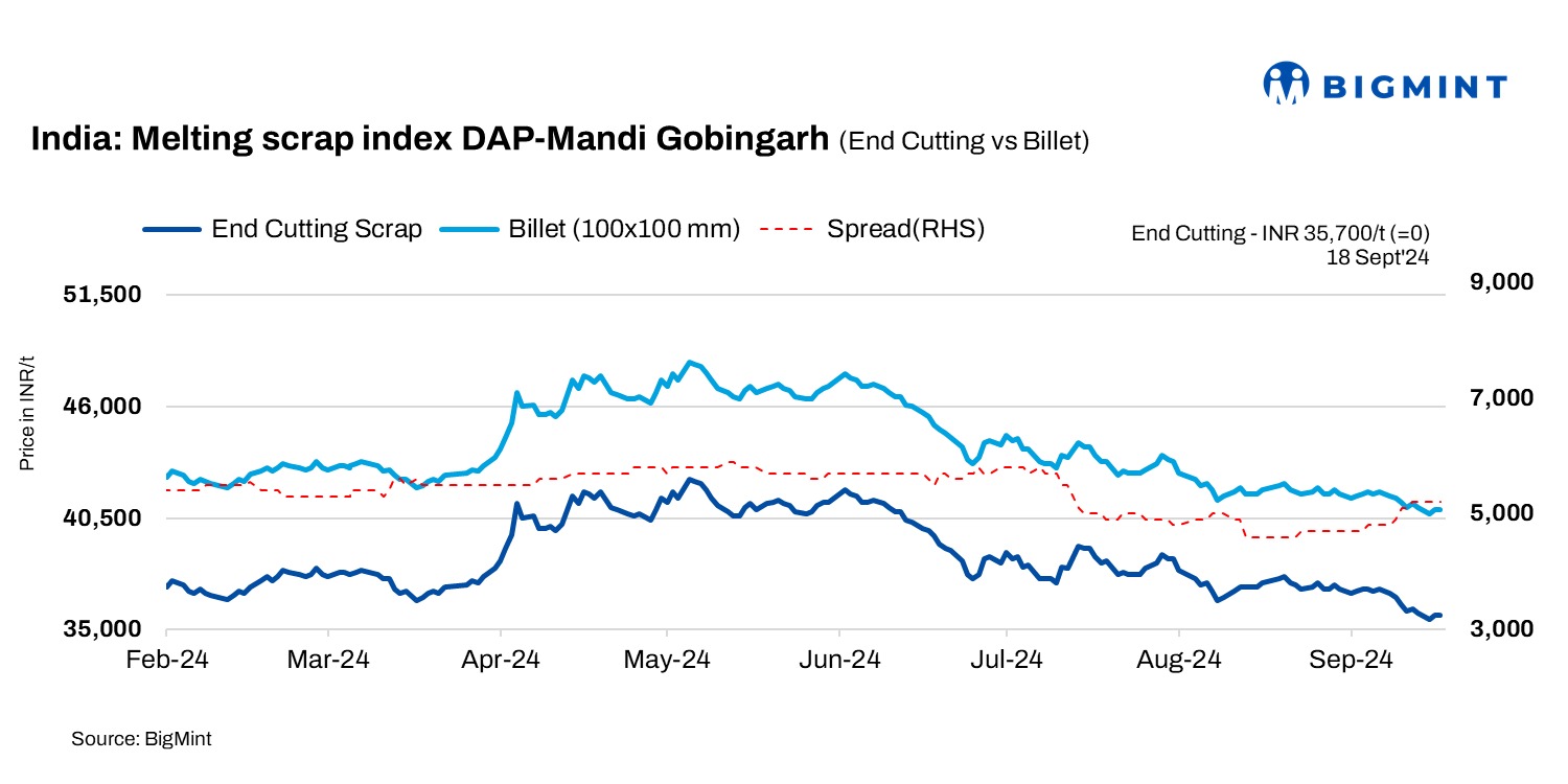 End-cutting-billets spread: In Mandi, the end-cutting scrap and billet spread was at INR 5,200/t.