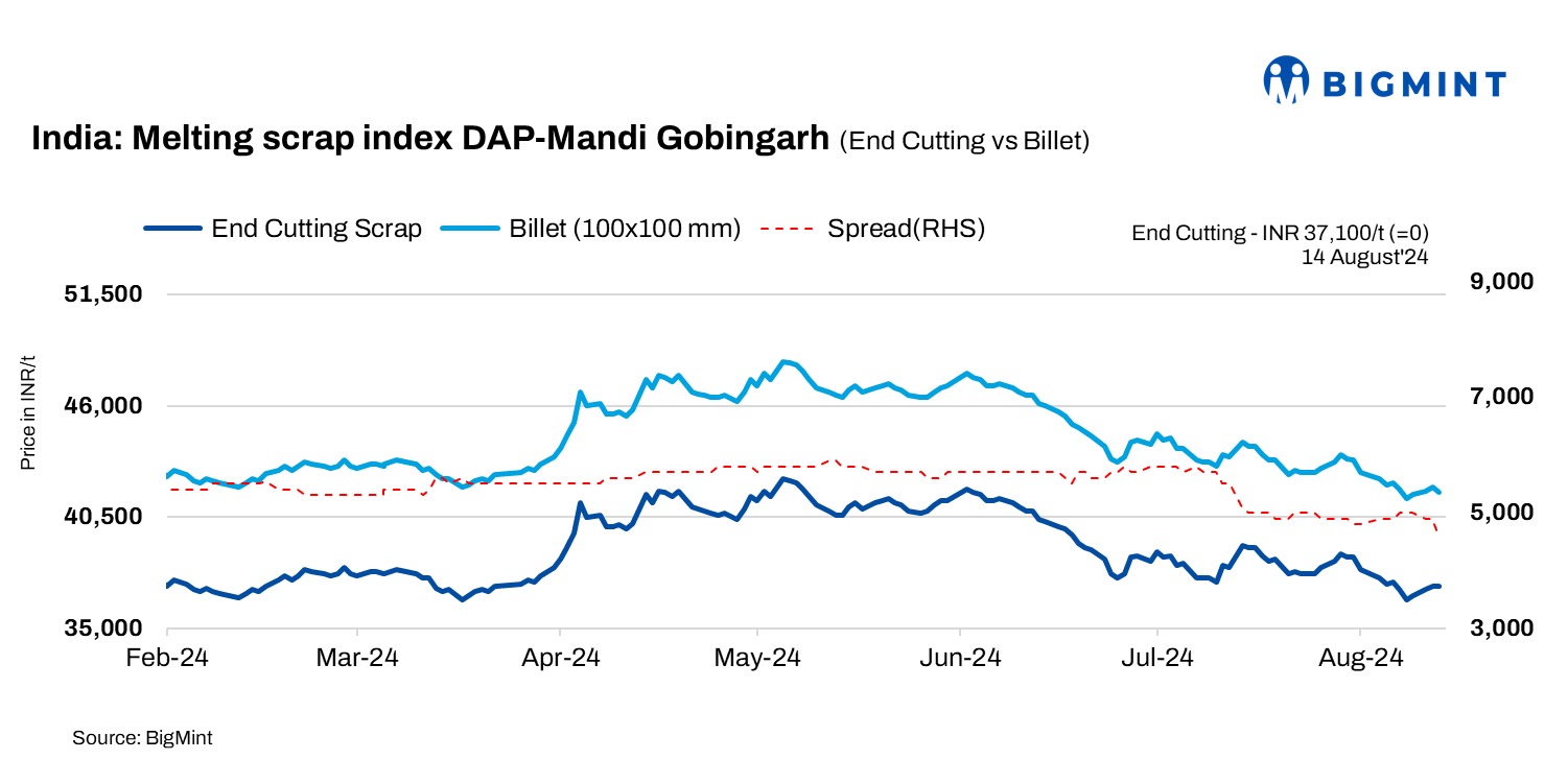 BigMint’s domestic end-cutting scrap index for the Mandi Gobindgarh market remained steady at INR 37,100/t DAP on 14 August 2024. In the mandi steel market, disparities in pricing between scrap buyers and sellers continued, exacerbated by a shortage of scrap supply.