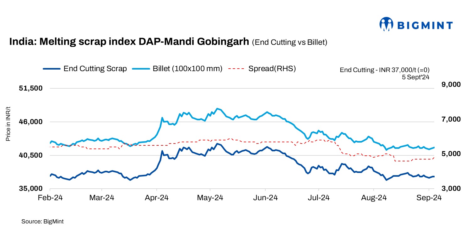 End-cutting-billets spread: In Mandi, the end-cutting scrap and billet spread was at INR 4,700-5,000/t.