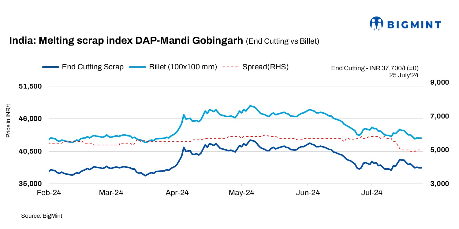 BigMint’s domestic end-cutting scrap index tracking the Mandi Gobindgarh market remained stable at INR 37,700/t DAP on 25 July, 2024.