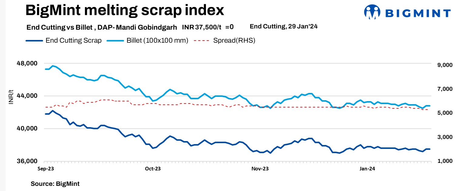 BigMint’s domestic steel scrap (end-cutting) index remained stable at INR 37,500/t DAP Mandi Gobindgarh on 29 January, 2024. In today’s market, scrap trading showed a moderate pace as mills secured scrap at decent levels. The heightened demand for sponge iron in Mandi can be attributed to the scarcity of scrap and the impracticality of relying on imported scrap, which remained unavailable.
