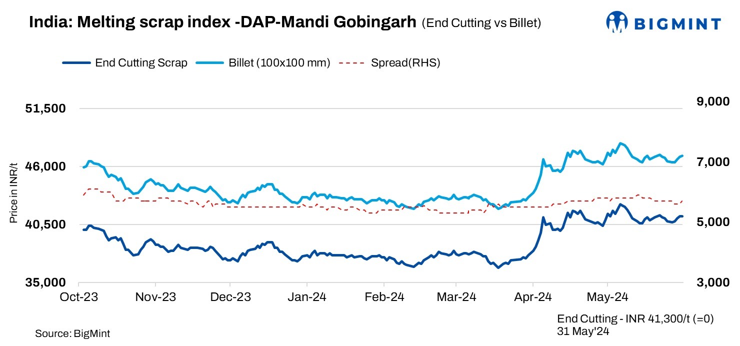 BigMint’s domestic end-cutting scrap index for the Mandi Gobindgarh market remained stable at INR 41,300/t DAP on 31 May, 2024. Moderate trade activity was seen in the region today, with mills persisting with their routine scrap purchases. Moreover, ongoing scrap shortages and liquidity concerns have kept prices range-bound over the past week.