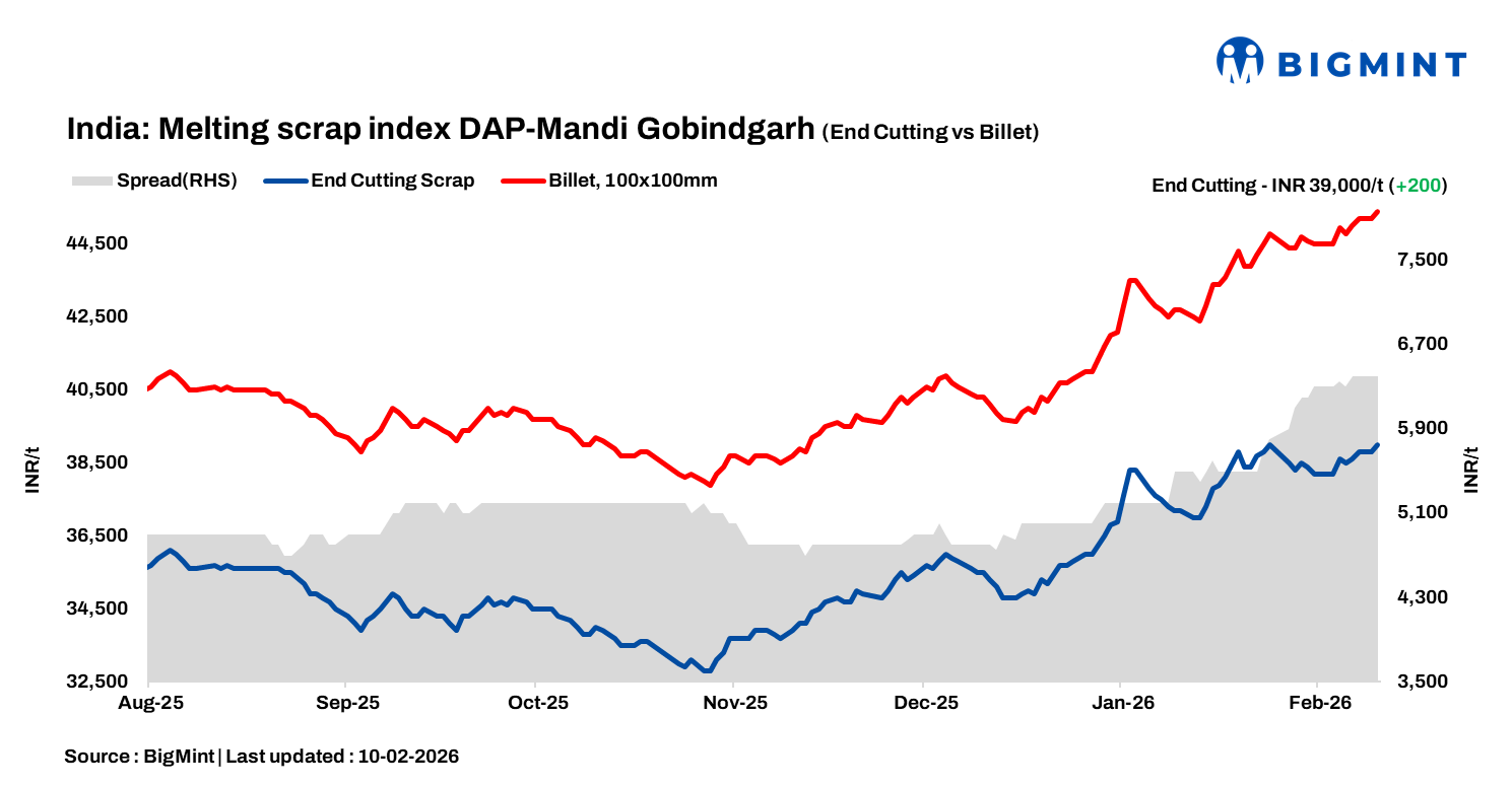 BigMint’s end-cutting scrap index, tracking Mandi Gobindgarh, rose INR 200/t d-o-d to INR 39,000/t DAP on 10 February. Semi-finished steel prices surged INR 250/t d-o-d, likely lifting scrap further. Demand picked up early but cooled as buyers turned cautious amid the rally, slowing trade. Regional scrap buying stayed robust, with mills eyeing further gains and buyers awaiting a steel price dip.