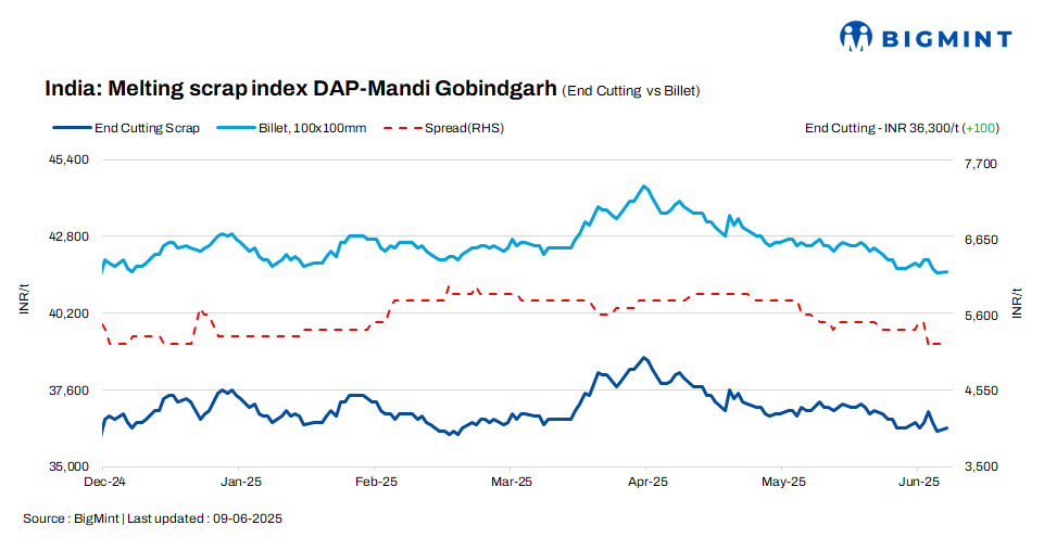 BigMint’s domestic end-cutting scrap index in the Mandi Gobindgarh market edged up by INR 100 /t d-o-d, reaching INR 36,300/t DAP on 9 June 2025. A mild shortage of scrap in the Mandi Gobindgarh market prompted suppliers to raise their offers, despite ongoing sales pressure in the semi-finished and finished steel segments.