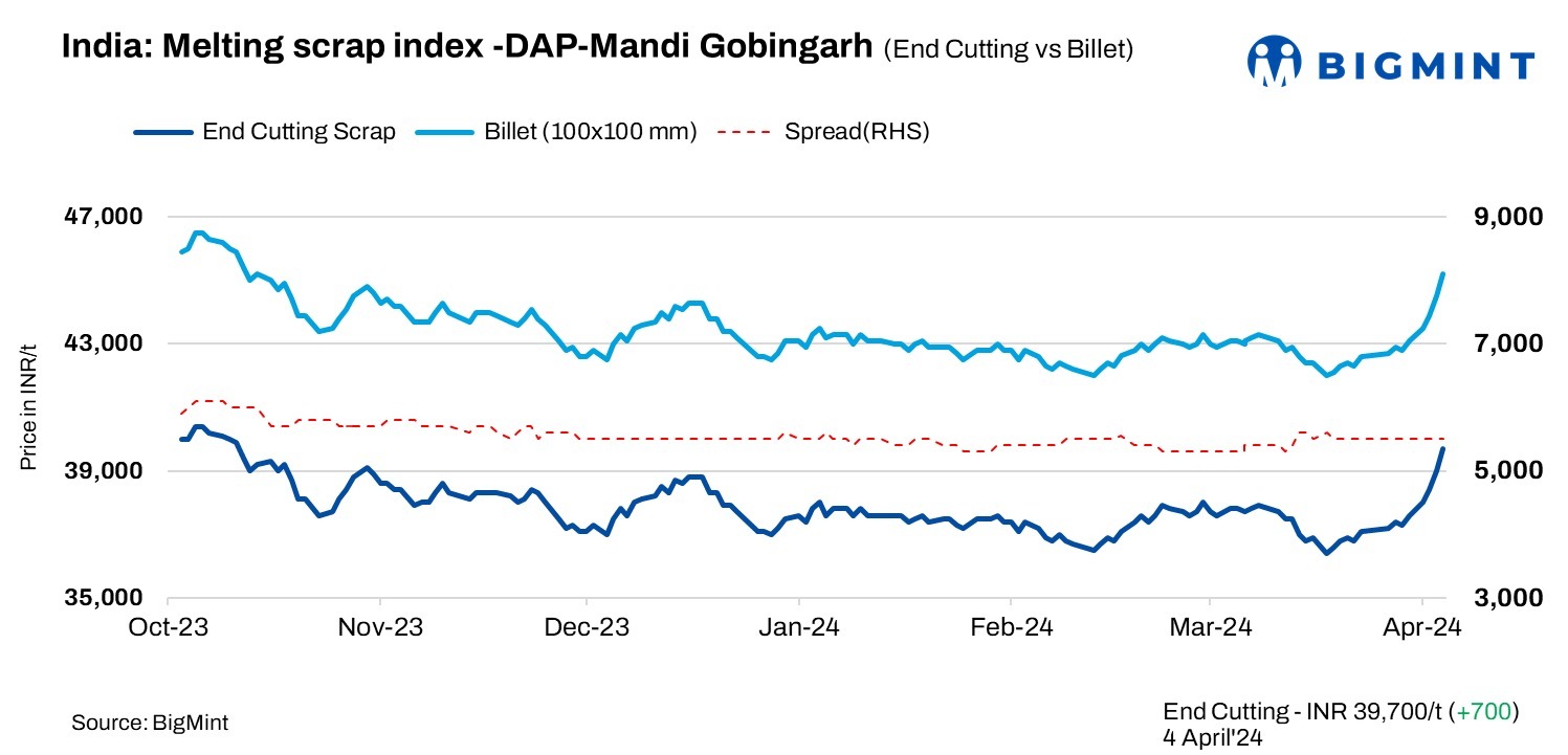 BigMint’s data for 4 April, 2024 revealed a rise of INR 700/t in the domestic steel scrap index (end-cutting) in Mandi Gobindgarh, reaching INR 39,700/t on a delivered-at-plant (DAP) basis. The market is experiencing a shortage of scrap, yet buyers are hesitant to purchase imported scrap given the current situation.