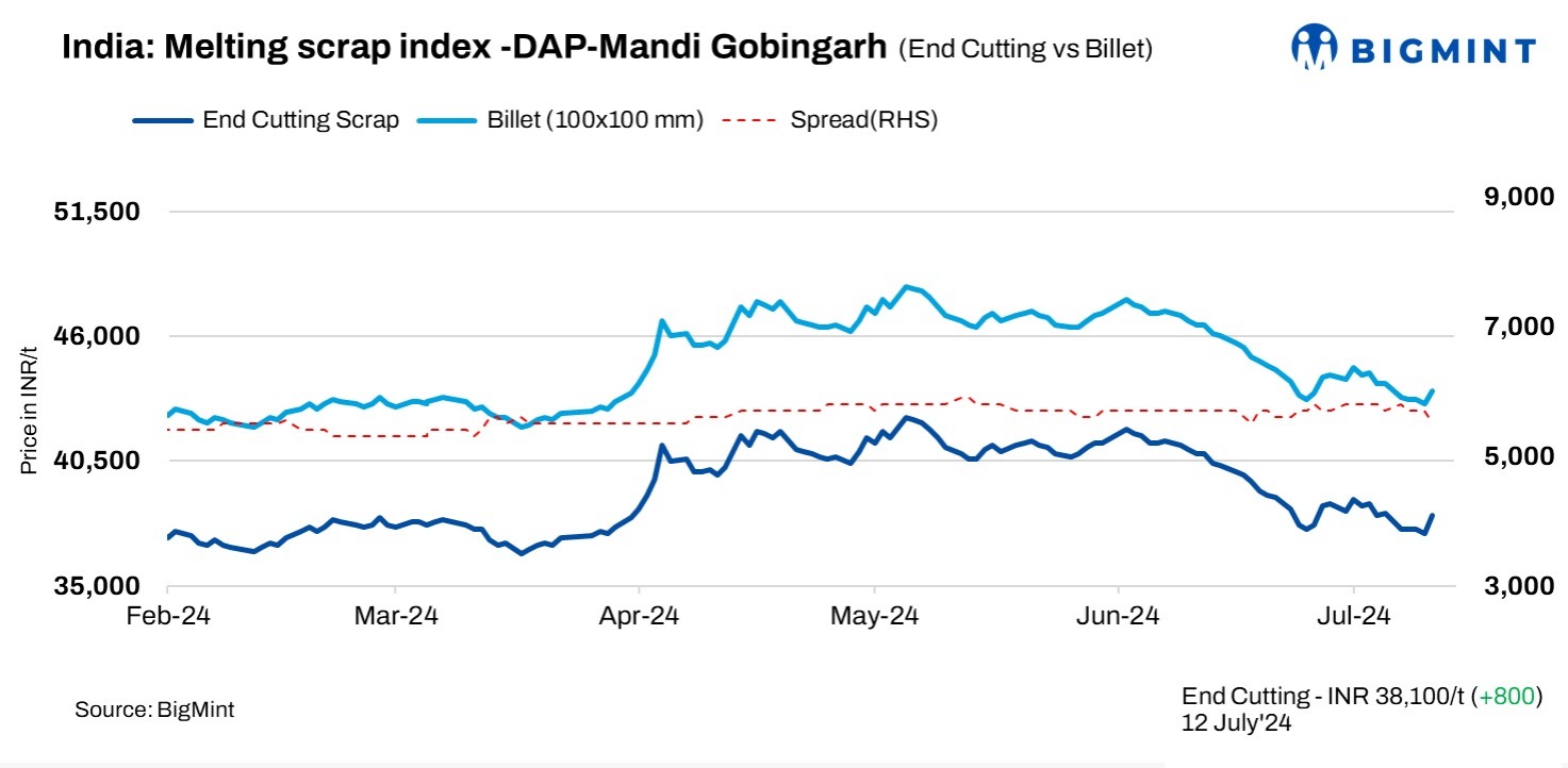 BigMint’s domestic end-cutting scrap index in the Mandi Gobindgarh market increased by INR 800/tonne (t) to INR 38,100/t DAP on 12 July, 2024. The scrap market witnessed an uptrend, with prices rising by INR 800-1,000/t across grades. The region continues to face shortage of scrap and liquidity problems.