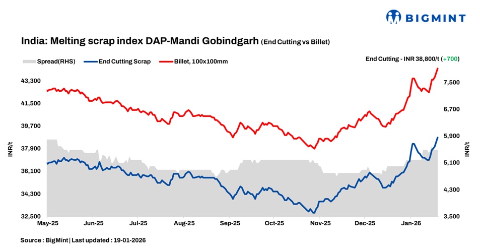 BigMint’s domestic end-cutting scrap index, tracking the Mandi Gobindgarh market, increased by INR 700/tonne (t) d-o-d to INR 38,800/t DAP on 19 January 2026. In today’s Mandi Gobindgarh steel market, semi-finished and finished steel prices rose by INR 500/t d-o-d, a trend expected to lift scrap prices as well. Demand had picked up slightly since last Saturday, but buyers turned cautious amid the price uptick. The market stayed quiet in the second half of today’s trading session.