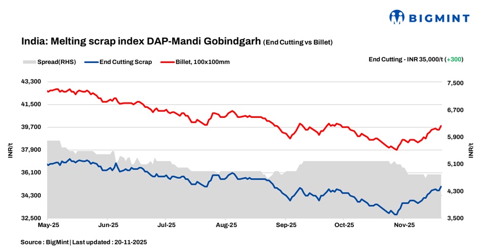 BigMint’s domestic end-cutting scrap index, tracking the Mandi Gobindgarh market, increased by INR 300/tonne (t) d-o-d to INR 35,000/t DAP on 20 November 2025.