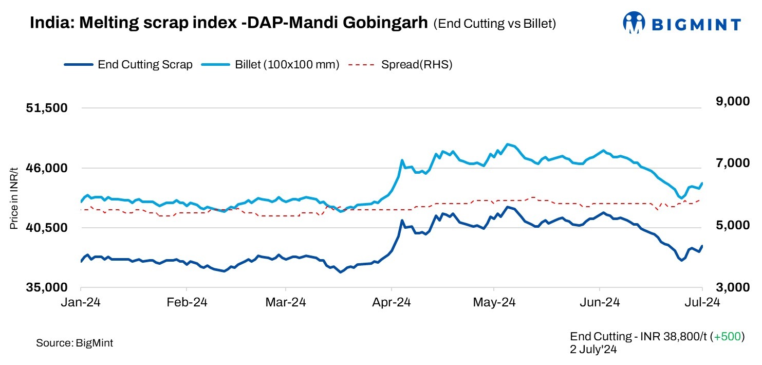 BigMint’s domestic end-cutting scrap index for the Mandi Gobindgarh market rose by INR 500/tonne (t) ($6/t) to INR 38,800/t DAP on 2 July, 2024. Trade activity in scrap picked up during today’s session, with mills in Mandi Gobindgarh actively purchasing domestic scrap. The semi-finished steel market saw some spot bookings, and ingot prices increased by INR 400/t.