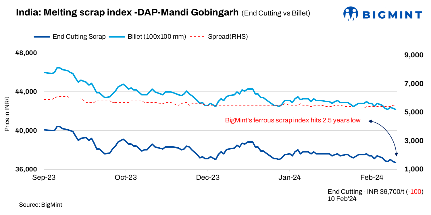 The index for domestic steel scrap (end-cutting) in Mandi Gobindgarh declined by INR 100 per tonne (t), reaching INR 36,700/t on a delivered-at-plant (DAP) basis on 10 February, 2024