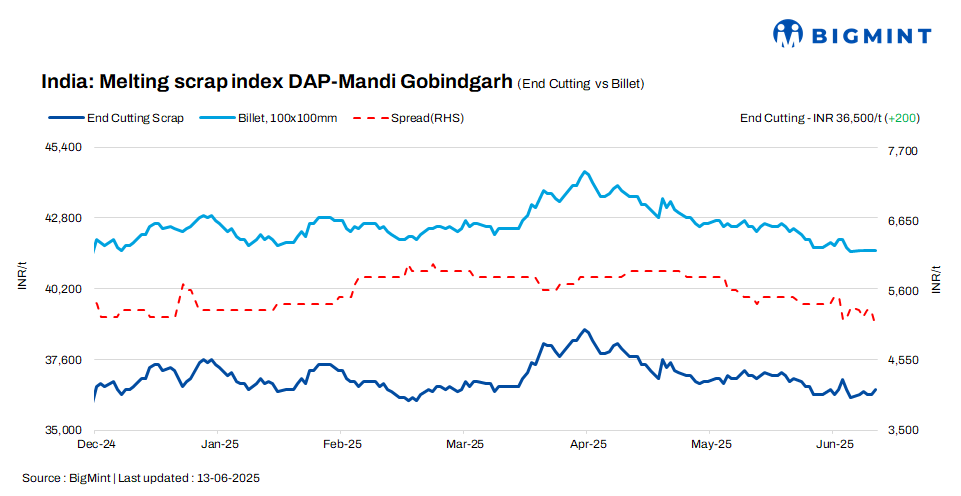 BigMint’s domestic end-cutting scrap index, tracking the Mandi Gobindgarh market, increased by INR 200/tonne (t) d-o-d to INR 36,500/t DAP on 13 June 2025. Mild scrap shortage and ongoing GST checks were seen in the market today, prompting scrap suppliers to raise their offers.