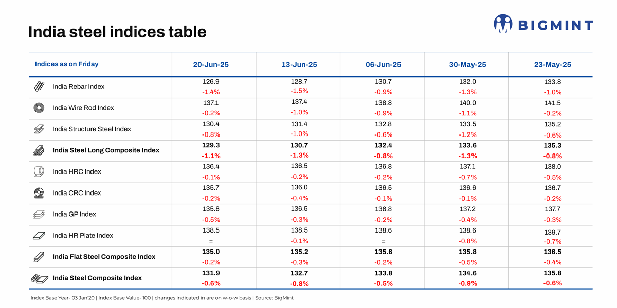 Morning Brief: The depression in the domestic steel market continued last week, with steel prices witnessing a steady downward spiral. BigMint’s India steel composite index, a fixed reference point for the domestic steel market, dropped 0.6% w-o-w on 20 June 2025, with long steel prices correcting more sharply than flats.