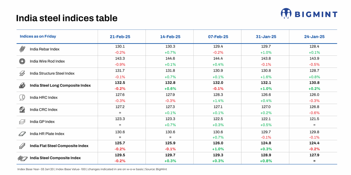 Morning Brief: BigMint’s Steel Composite Index edged down by 0.2% w-o-w to 129.5 points on 21 February 2025, as dull market sentiments stalled the incremental uptrend seen over the past few weeks.