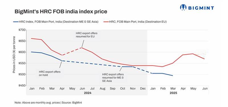BigMint’s India HRC (hot-rolled coil, S275) export index (for the Europe and Middle East) dropped by $15/tonne (t) to $555/t FOB eastern Indian port. Buying interest from the European Union (EU) was weak amid slow demand from the automotive and construction sectors. Moreover, buyers in the EU were cautious, resulting in slow trade activities ahead of the Corpus Christi holiday (19 June 2025) in some European regions.