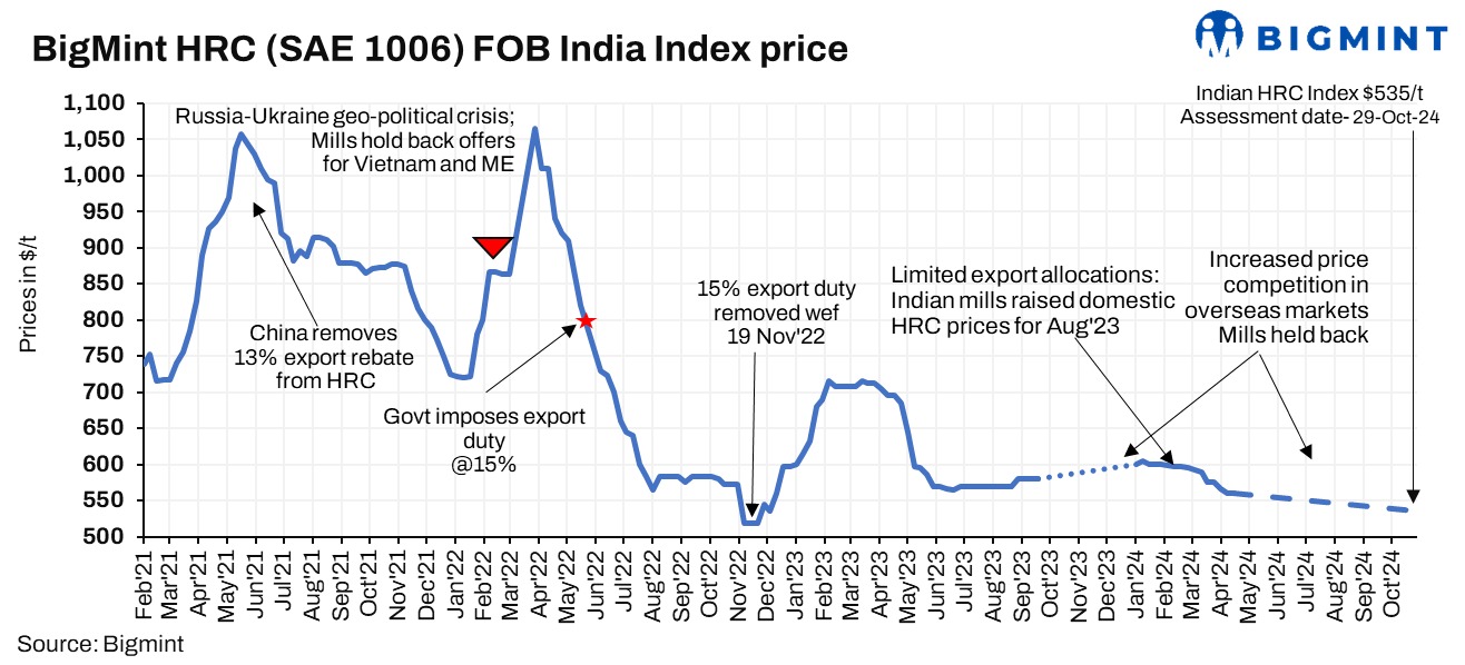 BigMint’s India hot-rolled coil (HRC, SAE1006) export index (for the Middle East and Vietnam) resumed after six months amid recent deals. Current prices are at $535/t FOB east coast India. An Indian steel major booked 20,000-25,000 tonnes (t) of HRCs for the Middle East (ME). However, European demand remained subdued due to sluggish market sentiments and ongoing anti-dumping investigations, limiting export volumes to smaller quantities.