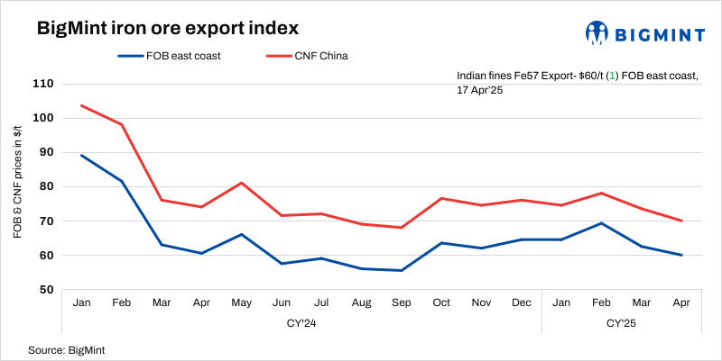 BigMint’s bi-weekly Indian low-grade iron ore fines (Fe 57%) export index inched up by $1/tonne (t) w-o-w to $60/t FOB east coast, India, on 17 April 2025. Trade activity in the Indian Ocean remained subdued amid a lack of inquiries, while exporters were not ready to sell at current prices. Export deals for around 75,000 t were recorded in this publishing window.