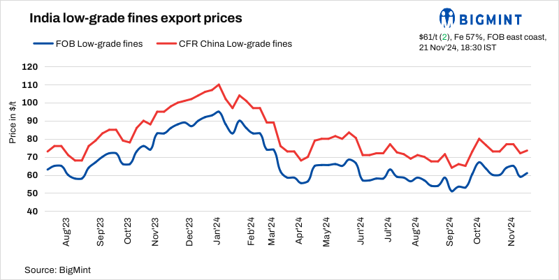 BigMint’s bi-weekly Indian low-grade iron ore fines (Fe 57%) export index increased by $2/tonne (t) w-o-w to $61/t FOB east coast, India, on 21 November 2024. Last week, a trader from Odisha concluded a deal for 55,000 t of fines (Fe57%) at $74/t CFR China. While another trader also concluded 55,000 t of fines (Fe57%) at $74-75/t CFR China at the beginning of this week.