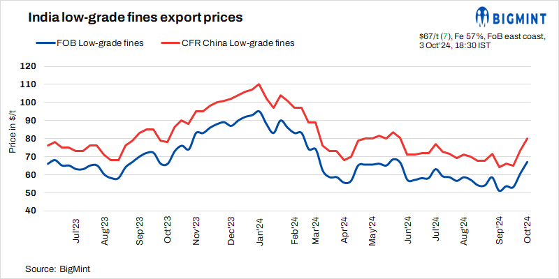 BigMint’s weekly Indian low-grade iron ore fines (Fe 57%) export index increased by $6.5/t w-o-w at $67/tonne (t) FOB east coast on 3 October 2024. Around 110,000 t Fe 57% fines deals were recorded from India at $80-85/t CFR China were recorded in this week so far. The discount for lower-grade fines was 19% on the global fines index and remained stable compared to last week.