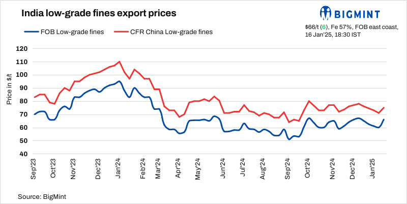 BigMint’s bi-weekly Indian low-grade iron ore fines (Fe 57%) export index rose by $6/t w-o-w to $66/t FOB east coast, India, on 16 January 2025. Around 165,000 t confirmed deals were recorded in the export market in this publishing window at the price of $74-76/t CFR China.
