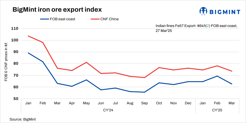 BigMint’s bi-weekly Indian low-grade iron ore fines (Fe 57%) export index increased by $2/t w-o-w to $64/t FOB east coast, India, on 27 March 2025. Export trades picked up this week, with three deals of around 160,000 t fines (Fe57%) concluded at $73-76/t CFR China recently. A few more deals of around 300,000 t fines (Fe50-55%) were also concluded.