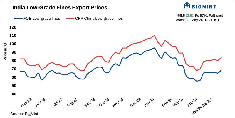 BigMint’s weekly Indian low-grade iron ore fines (Fe 57%) export index rose by $3.5/t w-o-w to $68.5/tonne (t) FOB east coast on 23 May 2024. The Indian seaborne market saw active deals in the week as buyers showed significant interest in Indian lower-grade material, driven by positive sentiments in the Chinese market.