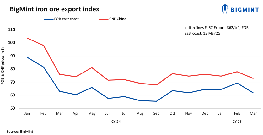 BigMint’s bi-weekly Indian low-grade iron ore fines (Fe 57%) export index remained stable w-o-w at $62/t FOB east coast, India, on 13 March 2025. Export deals remained absent in the east coast following weak market sentiments and lack of buying interest.