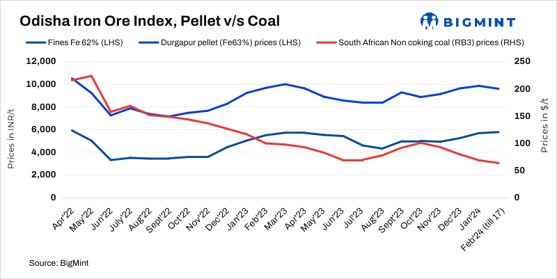 Notably, BigMint’s India pellet (Fe 63%, 3% Al) export (FOB east coast) index remained stable w-o-w at $115/t on 14 February 2024. The pellet export market has experienced a prolonged period of muted activity, with buyers absent due to the China Lunar holidays observed from 10-18 February. Buyers are on the sidelines during the holidays, which has kept the market sluggish.