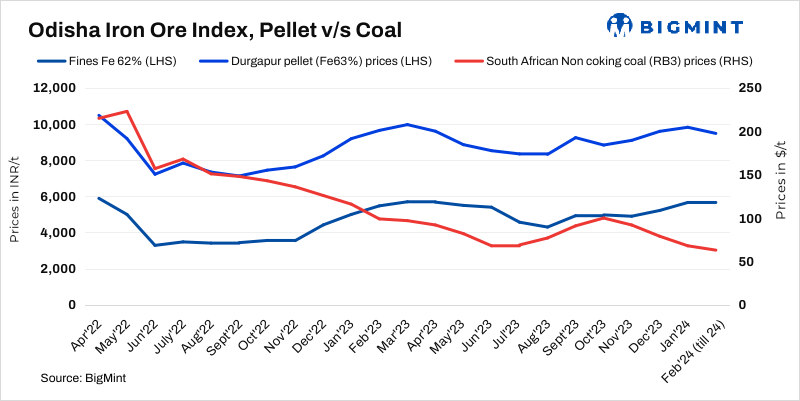 BigMint’s weekly Odisha iron ore fines (Fe 62%) index decreased by INR 200/t ($2) w-o-w to INR 5,450/t ($66) ex-mines on 24 February 2024.
