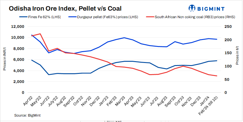 - Pellet prices decline in Barbil:Pellet (6-20 mm, Fe 63%) prices in Odisha’s Barbil decreased marginally by around INR 400/t w-o-w. The current assessment stands at INR 8,700/t loaded to wagon. However, pellet (Fe 63%, 6-20 mm) prices in Durgapur inched down by INR 100/t w-o-w to INR 9,650/t exw on 9 February.