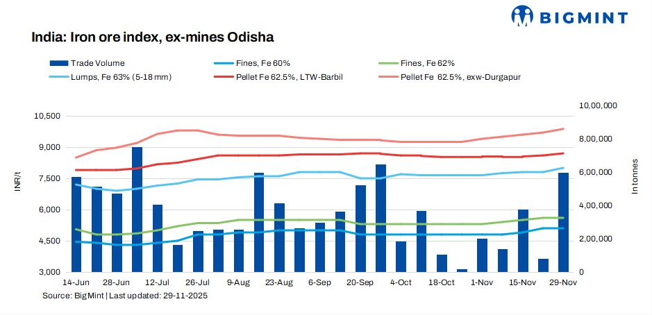 BigMint’s Odisha iron ore fines (Fe 62%) index remained stable w-o-w at INR 5,600/t ($63/t) ex-mines on 29 November 2025. BigMint recorded deals for around 600,000 t of iron ore this week, concluded directly by steelmakers.