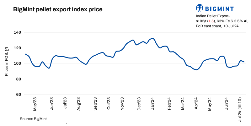 BigMint’s India pellet (Fe 63%, 3% Al) export index (FOB east coast) decreased by $1.5/t w-o-w to $102/t on 10 July 2024. No major trades were witnessed in this trading week as sellers kept their offers on hold following the price fluctuation in the seaborne market. However, around 500,000 t pellet (Fe 62-63%) export deals were recorded from India in the first ten days of July when global iron ore prices saw some strengthening.