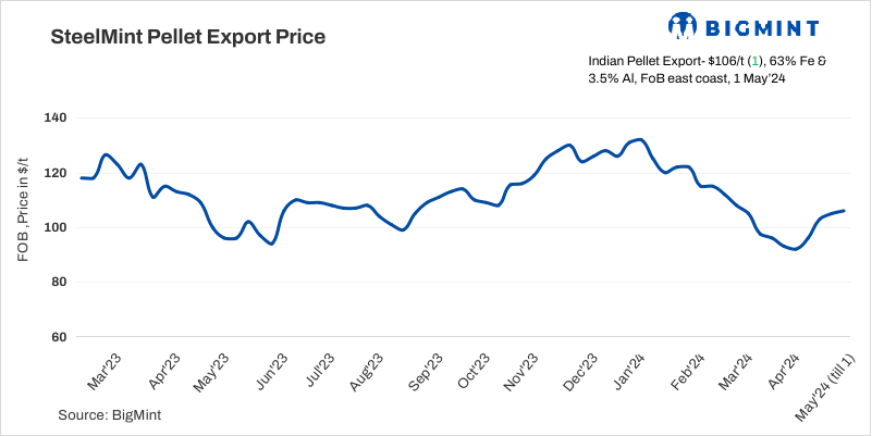 BigMint’s India pellet (Fe 63%, 3% Al) export index (FOB east coast) increased by $1/t w-o-w to $106/t on 1 May, 2024. The export market remained supportive last week following enhanced restocking activity by Chinese steelmakers ahead of the weeklong Labour Day holidays. Around 110,000 tonnes (t) (2 Supramax cargoes) pellet export deals were heard this week from the east coast of India at $120-122/t CFR China but not confirmed yet by the seller or buyer.