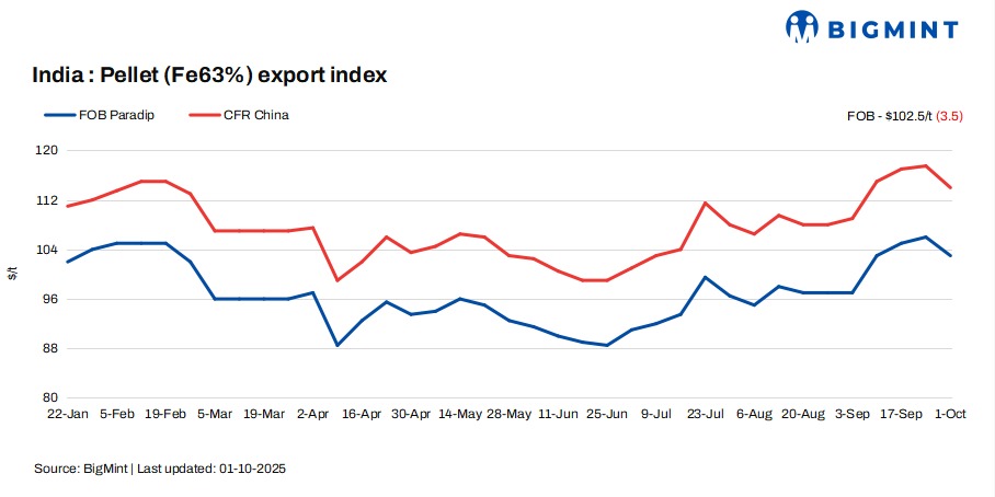 BigMint’s India pellet (Fe 63%, 3-3.5% Al) export index (FOB east coast) dropped by $3.5/t w-o-w to $102.5/t on 1 Oct’25. There were no export deals concluded in the sea market this week, resulting in silent deal sentiments. A few suppliers offered higher-grade cargo, but these remained unsold due to a disparity in bid offers as Chinese buyers are on holiday.