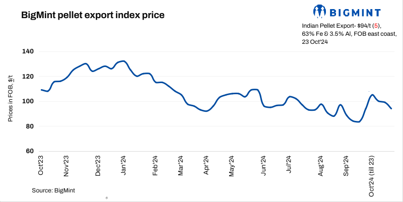 BigMint’s India pellet (Fe 63%, 3% Al) export index (FOB east coast) decreased by $5/tonne (t) w-o-w to $94/t on 23 October 2024. No export deals were concluded in this publishing window. As per sources, a South Korean mill recently purchased a Fe63% pellet cargo from a producer in eastern India at a decent premium, but the deal is yet to be confirmed by the parties involved.