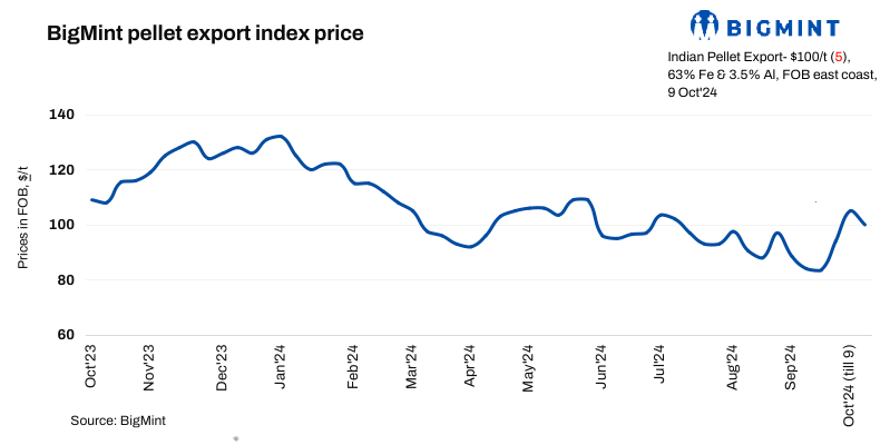 BigMint’s India pellet (Fe 63%, 3% Al) export index (FOB east coast) decreased by $5/tonne (t) w-o-w to $100/t on 9 October 2024. No pellet export deals were concluded in India in this publishing window.