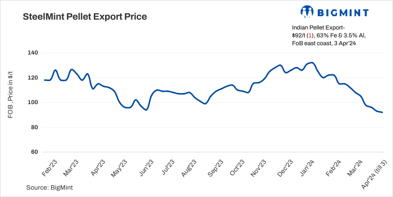 BigMint’s India pellet (Fe 63%, 3% Al) export index (FOB east coast) inched down by $1/tonne (t) to $92/t on 3 April 2024. The seaborne pellet prices have continued to decline over the past few months amid bearish market sentiments and lack of transactions. Prices fell to four-year low the last time it reached such low levels was recorded in April 2020, as per data maintained with BigMint.