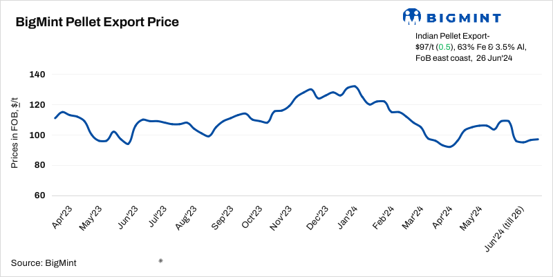 BigMint’s India pellet (Fe 63%, 3% Al) export index (FOB east coast) inched up by $0.5/t w-o-w to $97/t on 26 June 2024. An eastern India-based pellet producer concluded last week an export deal for 60,000 t of pellets (Fe63%, 8% SiO2+ Al2O3) at around $116-117/t CFR China for July, 2024 shipment. However, no other sellers’ deal was recorded as Indian pellets demand remained weak in the Chinese market as mills were seeking cheaper material.
