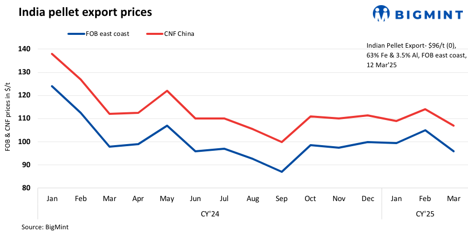 BigMint’s India pellet (Fe 63%, 3% Al) export index (FOB east coast) remained stable w-o-w at $96/tonne (t) on 12 March 2025 against the previous assessment on 7 March. No trades were recorded this week from the east coast.