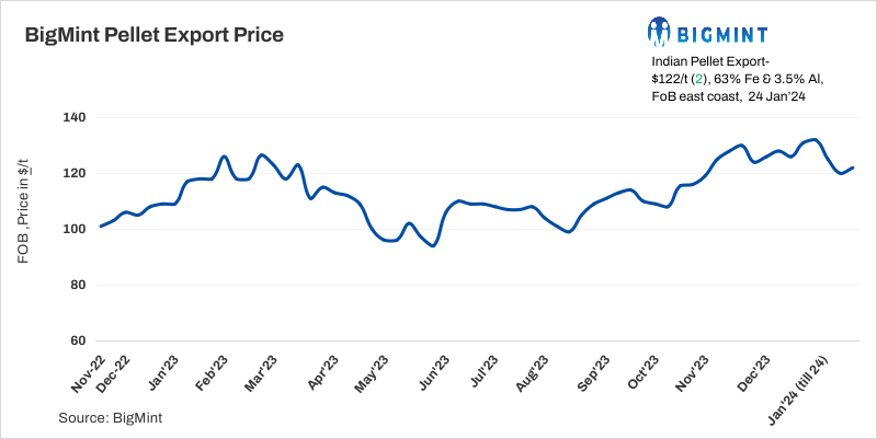 BigMint’s India pellet (Fe 63%, 3% Al) export (FOB east coast) index increased by $2/t w-o-w to $122/t on 24 January, 2024. No deals were recorded from the East Coast in the absence of firm inquiries, while some players continue to hold back offers owing to lower bids.