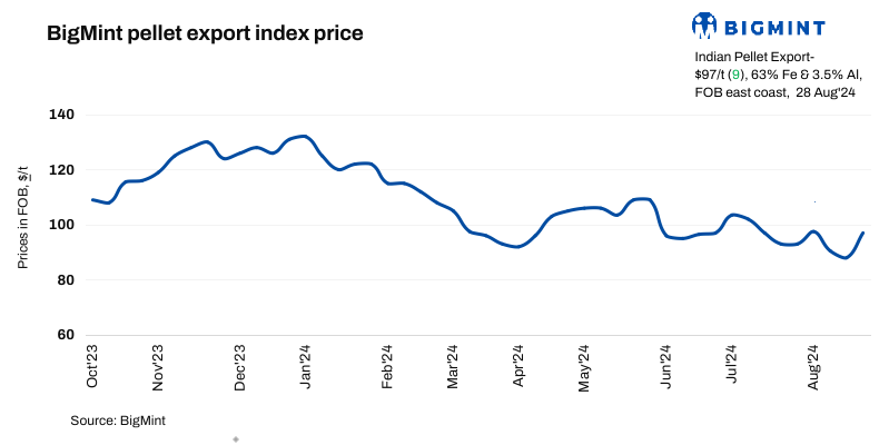 Pellet prices and sentiments in the seaborne market improved after the recent pellet export deals by Odisha-based pellet producers. The pellet prices remained northward and market participants are eyeing higher price levels for tenders floated. BigMint’s India pellet (Fe 63%, 3% Al) export index (FOB east coast) increased by $9/t w-o-w to $97/tonne (t) on 28 August 2024.